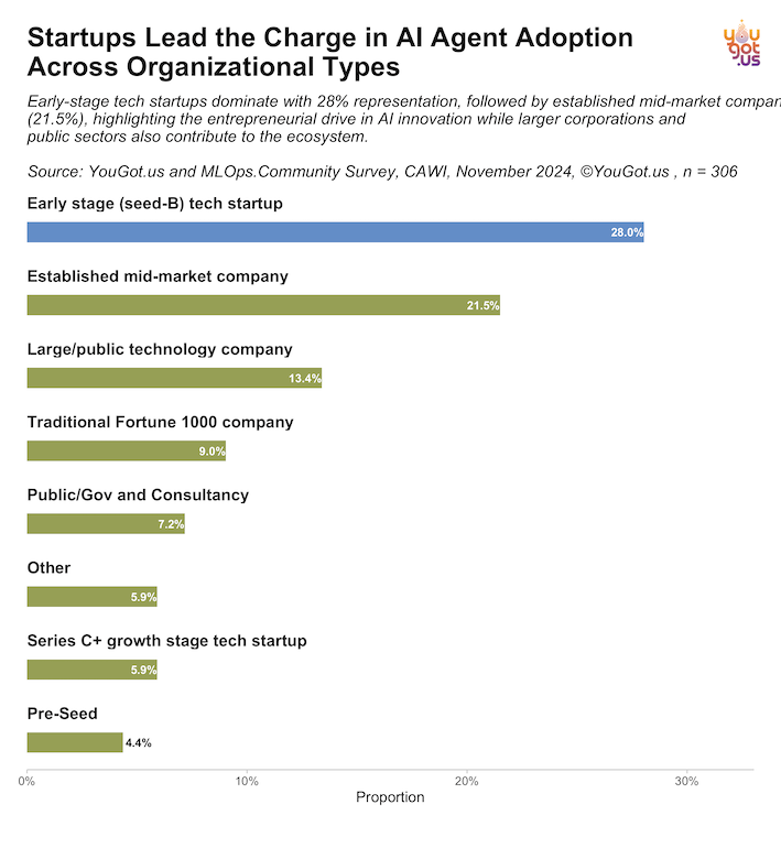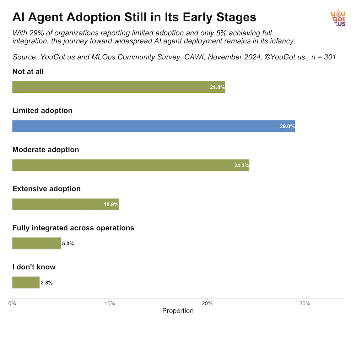 In November 2024, YouGot.us surveyed over 300 practitioners during a Prosus/MLops.Community Event about AI Agents in Production, to see who is implementing AI agents in day-to-day operations, how they are doing it, and what’s holding them back. Are high-level executives taking the plunge, or are AI/ML engineers steering the strategy? Why do some industries greet AI agents with open arms while others stay on the sidelines? Most importantly, how does actual adoption stack up against the hype? This report aims to answer these questions, providing a data-driven perspective on whether AI agents truly live up to their promise—and what it will take to make them indispensable across sectors.