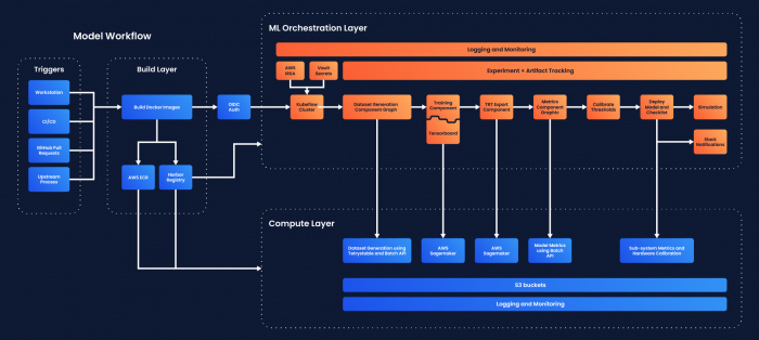 To address these pain points and allow our developers to more effectively navigate through these complex distributed systems and processes without sacrificing development velocity, we decided to design an ML-specific orchestration layer within the ML model development workflow, tailored for AV development. The model development workflow would be split into three layers: