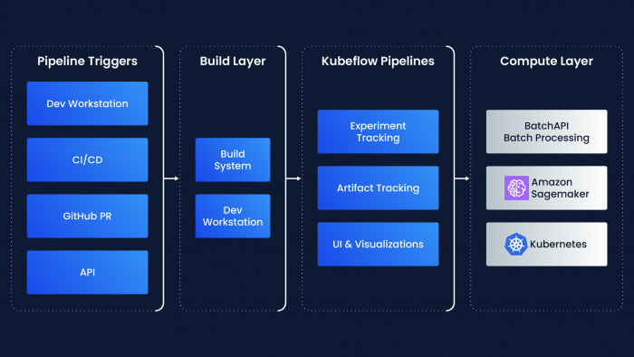 We chose open-source Kubeflow Pipelines as our ML orchestration layer since it provides us with a rich set of foundations (UI, metadata tracking, common ML tools) and allows us to extend to domain-specific vertical features (in-house metrics and visualization integration). Standing up a Kubeflow cluster and necessary infrastructure was an easier task thanks to existing expertise in running production Kubernetes clusters on our infrastructure team.