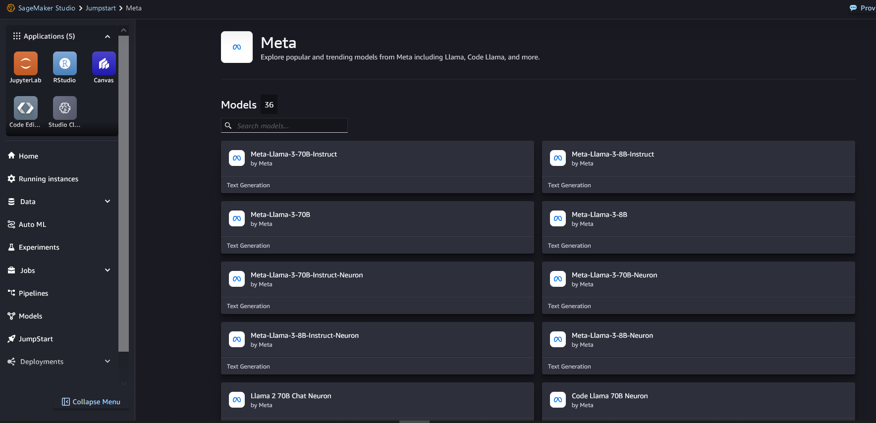Choose the Meta model card to list all the models from Meta on SageMaker JumpStart.