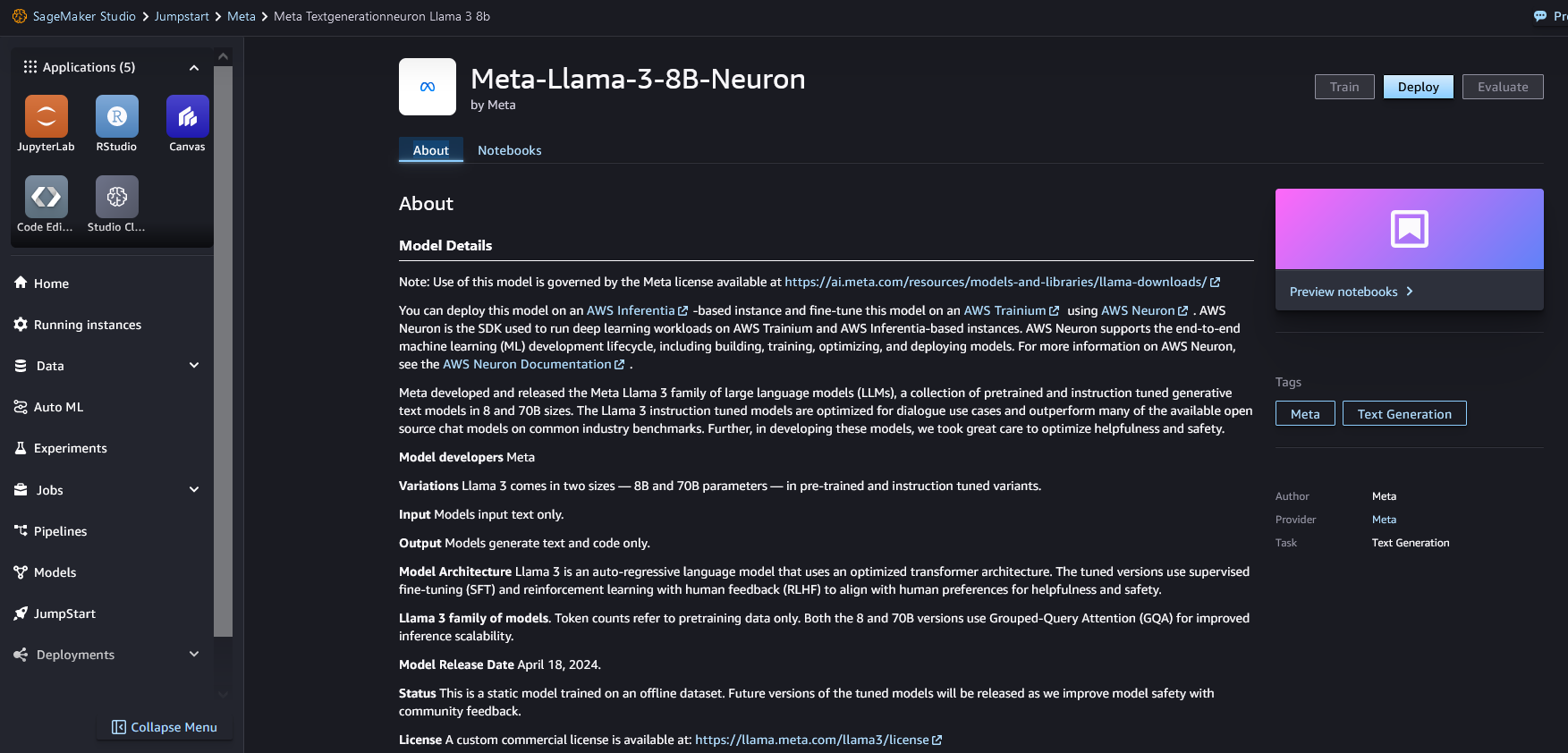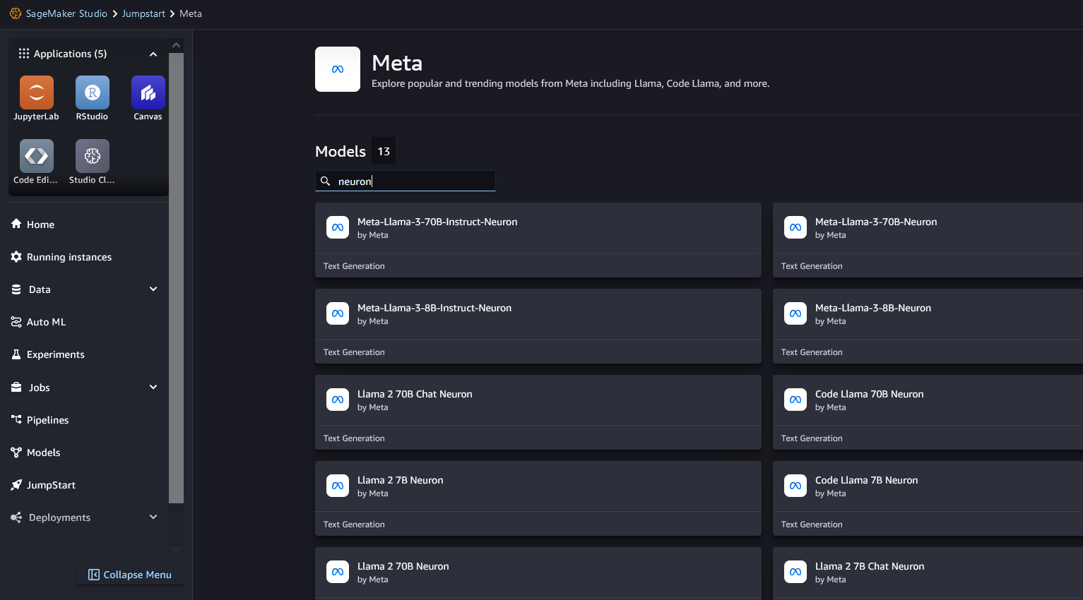 You can also find relevant model variants by searching for “neuron.” If you don’t see Meta Llama 3 models, update your SageMaker Studio version by shutting down and restarting SageMaker Studio.