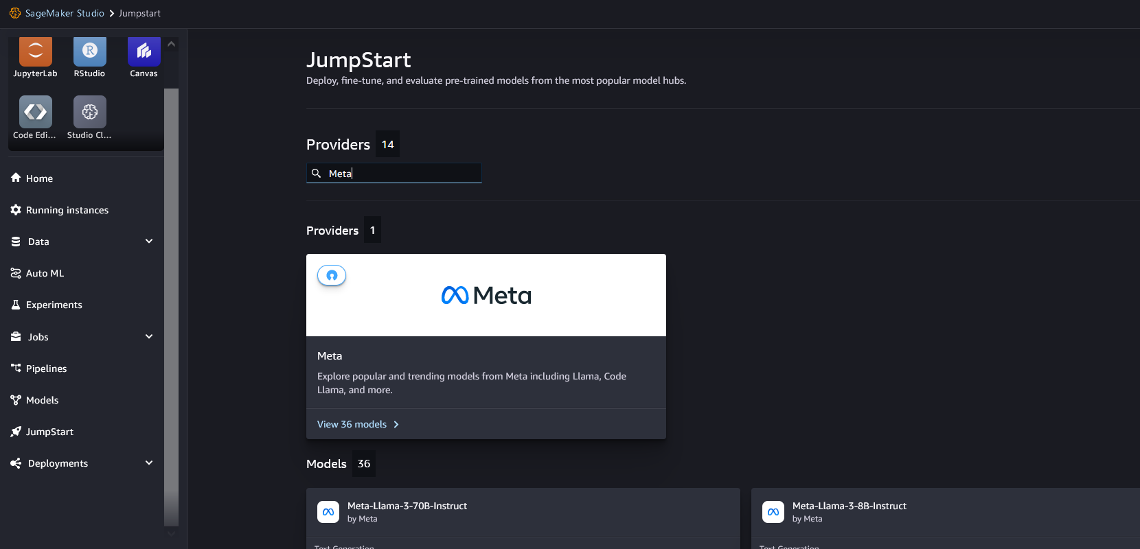 From the SageMaker JumpStart landing page, you can search for “Meta” in the search box.