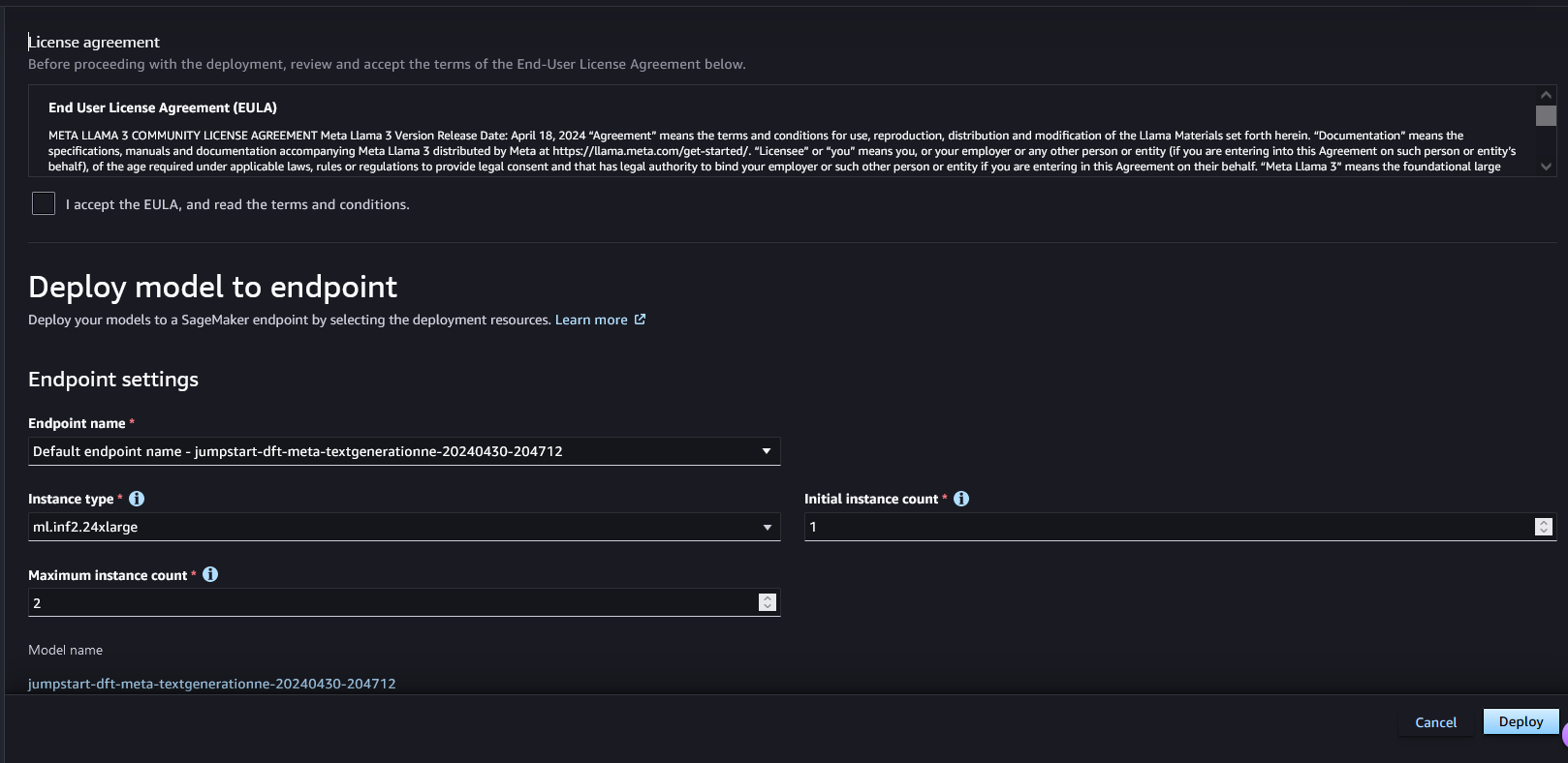 After you acknowledge the policies, provide your endpoint settings and choose Deploy to deploy the endpoint of the model.