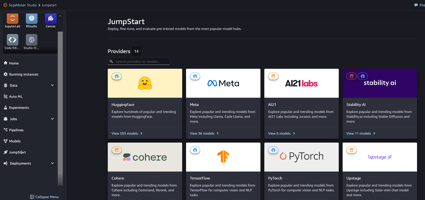 On the SageMaker Studio console, you can access SageMaker JumpStart by choosing JumpStart in the navigation pane. If you’re using SageMaker Studio Classic, refer to Open and use JumpStart in Studio Classic to navigate to the SageMaker JumpStart models.