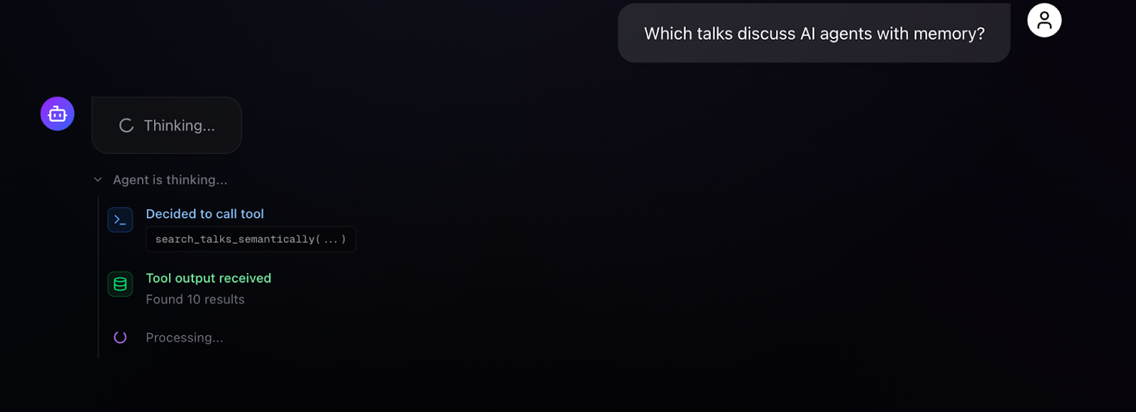 Fifth, tools must degrade gracefully. Database queries can fail, speakers might not exist, searches might return no results. Each tool handles these cases explicitly, returning informative messages rather than crashing. The agent can then communicate failures naturally to users or retry another tool or the same tool with different parameters (tried and tested!).