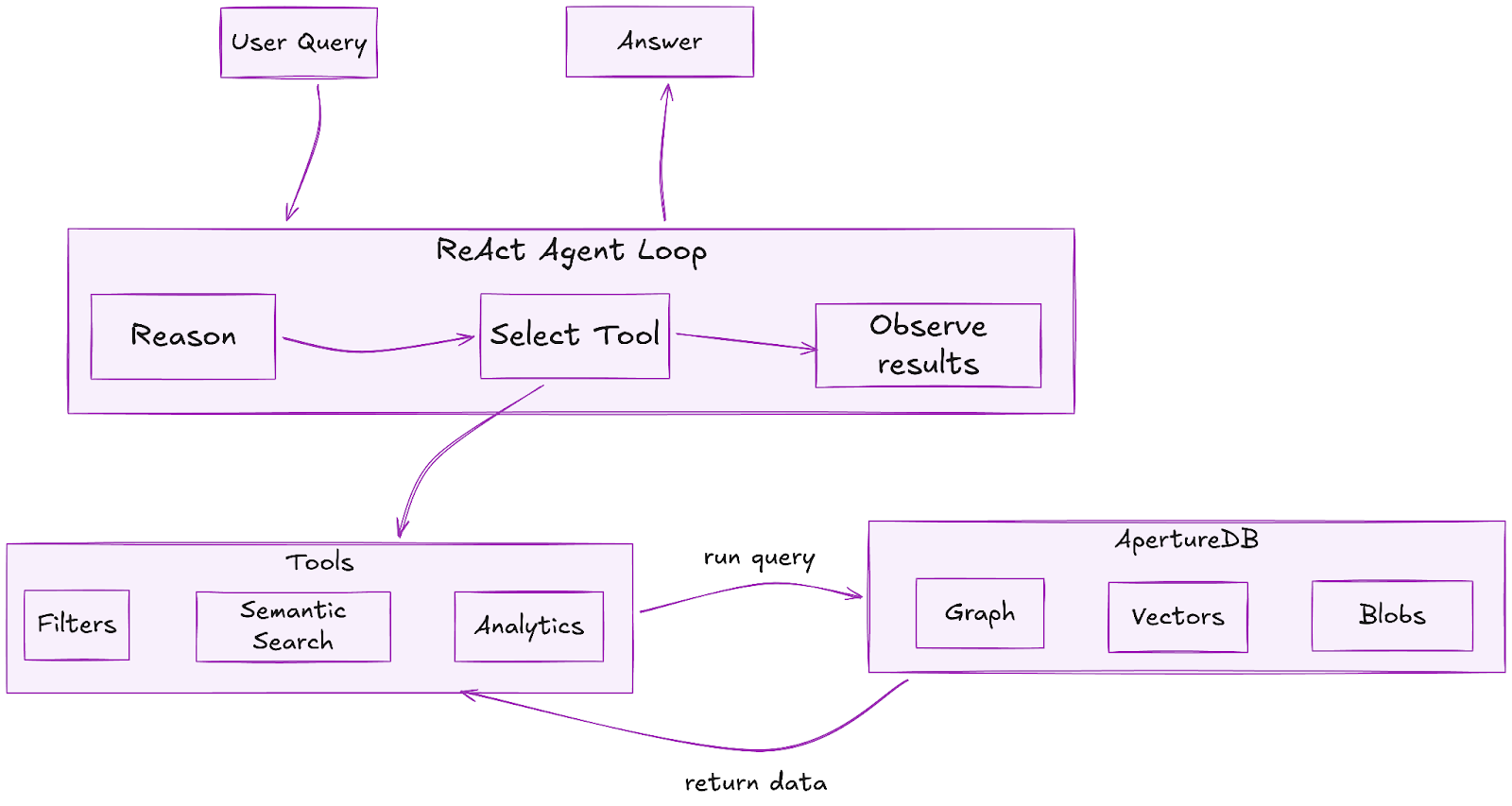 The diagram shows the execution flow of the agentic application. The user prompts the AI agent with a natural language query. The AI agent then iterates in a ReAct (reasoning + action) loop which involves reasoning or “thinking” about an action to take i.e deciding which tool best matches the query requirements and hence should be used, as well as which params the tool should be called with. Once the agent has reached a decision, it calls one or more tools (multiple tools can be called in parallel thanks to LangGraph), the tools execute ApertureDB queries under the hood, parse the raw result to strip away unnecessary details and information (like raw ApertureDB logs etc) and then return back to the AI agent. The AI agent uses the retrieved results to decide the next course of action – either calling a tool again or generating the final answer. The last tool call’s top 10 retrieved results (if they contain Talk items) are also returned and displayed in the UI for the user to navigate directly. An important thing to mention here is the importance of sanitizing the returned DB results so you only provide back to the LLM the necessary information rather than overloading its context window with unnecessary material. This type of context engineering requires a lot of nuance and curation but it heavily affects the quality of agentic applications.
