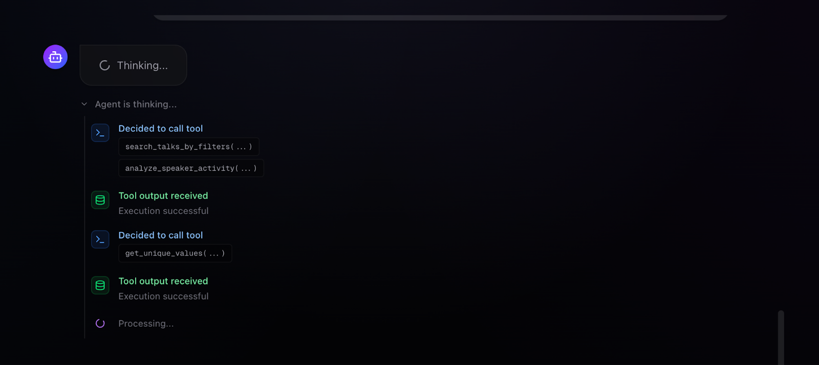 More interesting is multi-tool chaining. When asked “Find talks on Model development, training, and architecture and also give info on the top speakers for these talks,” the agent autonomously executes multiple tools in sequence: search_talks_by_filters to find relevant talks, analyze_speaker_activity to analyze the speakers presenting in this domain, and get_unique_values to discover available filtering options. The execution trace shows each tool call with its parameters, the success status, and processing indicators. The final response combines talk recommendations with speaker analytics identifying top contributors.