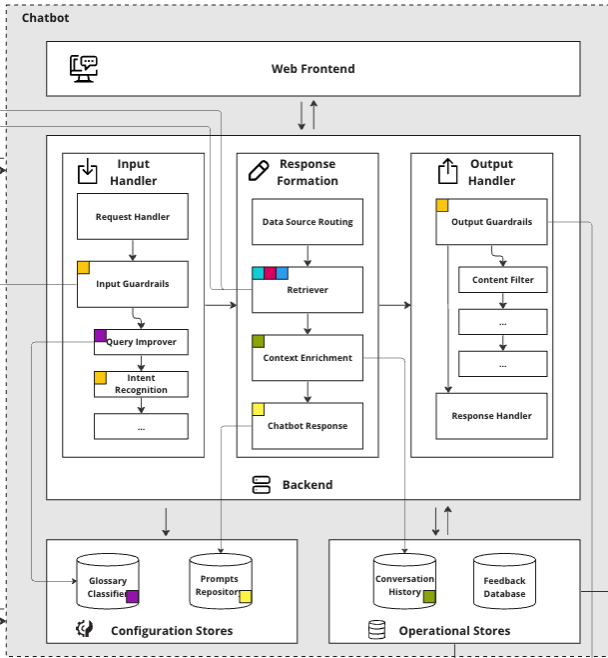 - Configuration Stores: This component contains glossaries for query improvement and prompts from response generation.