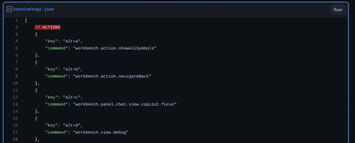 The code snippet provided below replaces Alt-key shortcuts with custom keybindings. For example, pressing “Alt+j” will move to the next editor, and “Alt+,” will open a new terminal. The code snippet is divided into several sections: