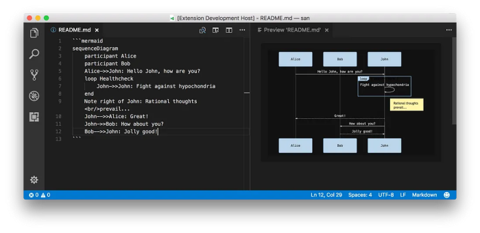 - bierner.markdown-mermaid: display Mermaid diagrams in Markdown. Great to share and visualize complex concepts and design decisions.