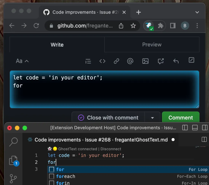 When VS Code’s reach seems limited, GhostText emerges as an ally. This Browser/VS Code extension enables you to edit browser text areas directly in VS Code. It offers bi-directional sync, allowing edits anywhere, anytime. Disengage sync when your editing is complete.