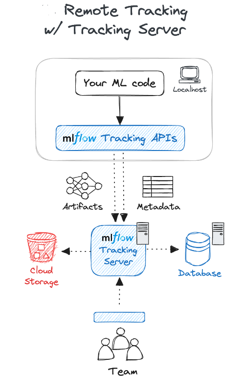 This configuration facilitates easy access to the MLflow server for all team members, allowing them to contribute experiments to the central platform from their respective systems. Such a configuration fosters smooth collaboration, streamlined organization, and accurate experiment tracking within the data science team.