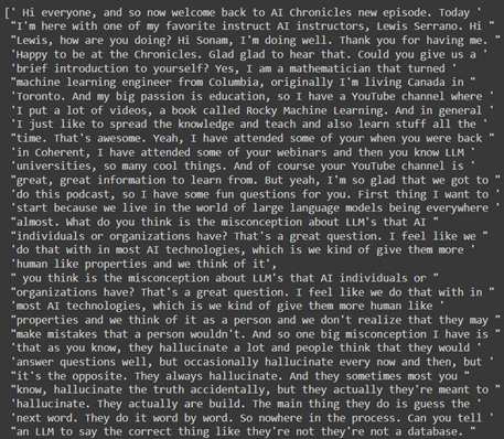 Given that the transcripts are long-form text, chunking was the smart choice to start the embedding process as it optimizes the text embedding process, making it more efficient, accurate, and scalable. There are quite a few chunking strategies to choose from, for instance, you can chunk text by splitting it into tokens, characters, paragraphs, and semantic boundaries. For a detailed comparison, check out this article where the author explains different chunking strategies and how to evaluate them. LangChain provides support for many of these chunking strategies and the one I used in this project is token text splitting with overlap. Here’s how: