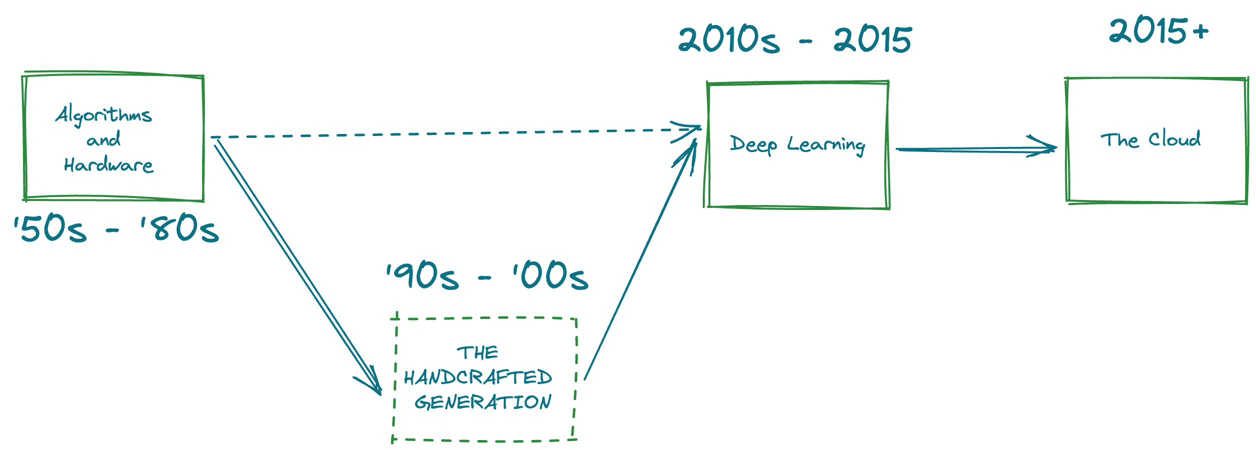 It all started in 2012. Three essential ingredients were in place. One – A large-scale dataset was created by Fei-Fei Li and Co. called ImageNet in 2009. Two – ConvNet’s patent had lapsed in 2007, and future iterations of Convolutional networks could be invented permissibly. Three – Gaming picked up with amazing games like Crysis and Skyrim requiring demanding GPU cards. What happened, as a result, was the organic combination of these raw materials. AlexNet came into being, essentially summarized as follows: “Let’s take a convolutional network and make it deeper because now we have more compute, and let’s train it on a supermassive dataset because now we have ImageNet”. They achieved amazing results on ImageNet and ushered in a new generation – which took a while to pick up because of the cost of computing. What this new deep learning generation achieved was the ability to scale the performance of one’s model to large data.
