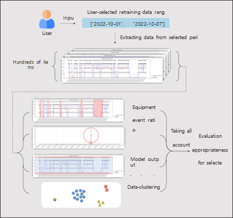 Furthermore, MakinaRocks’ solution also included an algorithm to determine the appropriateness of datasets for retraining, enabling general users of the solution to retrain ML models with the right data without the help of data scientists or ML engineers. During a major event, such as the replacement of a core part, the distribution of data under observation changes significantly, necessitating that the ML model be retrained with the new data. For lay users who lack data analysis skills, however, it is difficult to choose what data should be fed into the model for retraining.