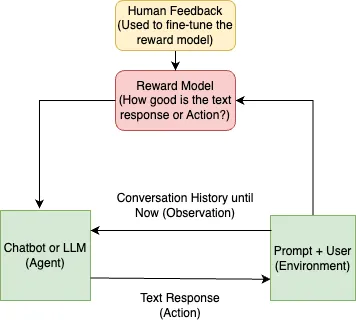 Reinforcement Learning with Human Feedback (RLHF) is one of the fundamental processes that enables LLMs to reason the world around them. Let’s visualize how RLHF works — say, we want to train a chatbot capable of human like reasoning and conversation. The system visualized as an RL model would look something like below-