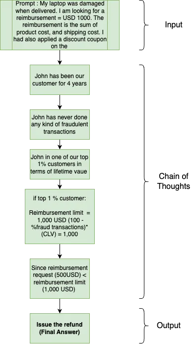 Consider your own thought process when solving a complicated reasoning task such as a multi-step math word problem. It is typical to decompose the problem into intermediate steps and solve each before giving the final answer: “After Jane gives 2 flowers to her mom she has 10 . . . then after she gives 3 to her dad she will have 7 . . . so the answer is 7.” Sounds like a chain of thought? Turns out if you provide a few shot examples of such chain of thoughts while prompting, the LLM responses on math and reasoning tasks become more accurate. This technique, also called Chain of Thoughts (CoT) prompting, is one of the most successful techniques in making LLMs better at reasoning. But how many examples does a prompt need and how should they look like? Somewhere around 8 seems to be the magic number. The official CoT paper by Google brain provides different set of 8 examples of each reasoning task i.e Math Word Problems, commonsense (Strategy), and Symbolic reasoning questions that you can pick from. You also don’t have to stick to these examples — turns out if you create your own examples in the format <Input, Chain of Thoughts (COTs), Output> or provide fewer examples (say somewhere between 4–8), LLMs still produce comparable responses. For my customer support chatbot project, I had to gather a team of annotators to create a repository of 1500 examples of CoT responses for customer support queries including reimbursement limit and ROI of an annual membership. Applying COT prompting has shown a significant improvement on GSM8K dataset — 17.9% to 58.1% in problem-solving rate ! Lets see how a CoT might look like for an input prompt- –