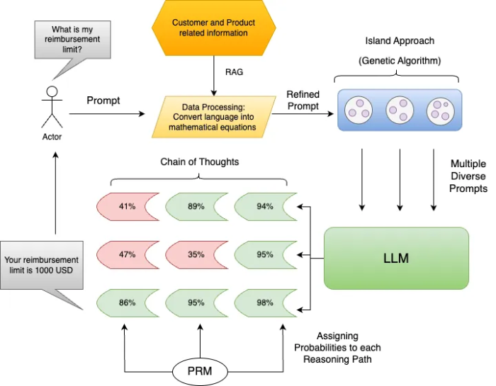 Chain of Thoughts (CoT) has its limitations. Let’s revisit the prompt in the CoT illustration— ‘I received a damaged laptop. What’s my reimbursement limit?’ In answering this, did you think of just line of reasoning? Not really ! There are many ways to get to the solution— “The customer is loyal so we should reimburse the entire cost” or “The product is not in the warranty period and the customer reached out much after the delivery date so we can only reimburse half the price” and so many more… So why should LLM explore just one chain of thought as prescribed by the CoT prompting? Like our own thought process, its better to explore multiple reasoning paths and then finalize the one that’s most reasonable. DIVERSE (Diverse Verifier on Reasoning Steps) method by Microsoft does that — it explores multiple chain of thoughts (~50 ) and selects the one that is most likely to lead to the correct answer. The multiple chains are created by sampling randomly from a pool of examples or from the decoder’s output. Each reasoning path is assigned a likelihood of leading to an accurate answer through a verifier, an LLM. Moreover, the verifier is step-aware i.e it analyzes the likelihood of every reasoning step. But why step awareness? It helps diagnose and rectify situations where a correct answer is obtained through a flawed reasoning, improving the overall reasoning proess. Authors of DIVERSE demonstrated that supplementing Chain of Thoughts (CoTs) with above modifications increases the problem solving rate on GSM8K dataset from 60% to 85%+ . Lets fall back to our reimbursement limit example to understand how DIVERSE can be applied to it successfully-
