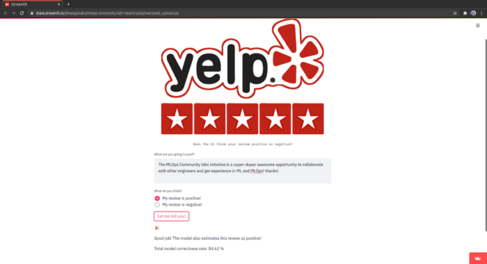 😎 From the MLOps perspective, there were several “stages” of the project evolution. First, we came up with a way of deploying the MLflow server on GCP and exposing it publicly. Also, we developed a nice Web UI where the user can write a review text and specify whether he or she considers this review to be positive or not, and then get the model’s response along with the statistics over all past requests. Having a Web UI talking to the model via REST API allowed us to decouple front-end and back-end and parallelise the development. Also, in order to decouple the logic of collecting model inference statistics to a database from the inference itself, we decided to implement a Model Proxy service with database access, and a Model Server exposing the model via a REST API. Thus, the Model Server could be seamlessly upgraded and replicated, if necessary. For the automatic model upgrade, we implemented another service called Model Operator, which constantly polls the state of model registry in MLflow and, if the release model version has changed, it automatically re-deploys the Model Server.